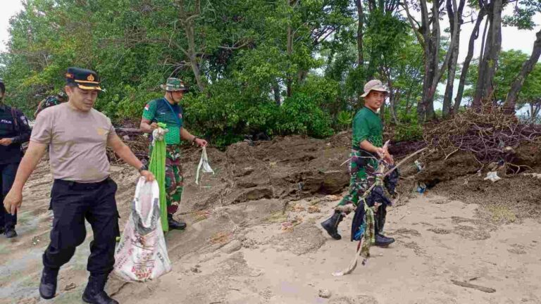 Aksi bersih-bersih pantai Sinergisitas TNI-Polri ini, melibatkan masyarakat termasuk perangkat desa setempat.