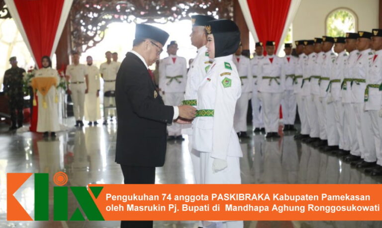 Pamekasan, klix.co.id – Penjabat Bupati Pamekasan, Madura, Jawa Timur, Masrukin mengukuhkan 74 pasukan pengibar bendera pusaka (paskibraka) di Mandhapa Aghung Ronggosukowati, Kamis (15/8/2024).